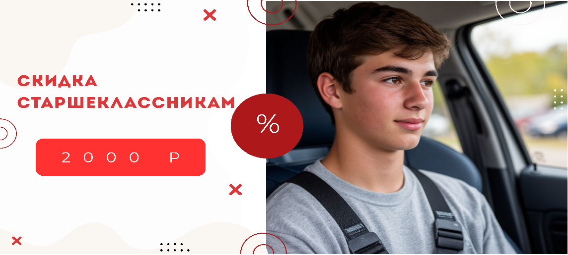Скидка для старшеклассников, которые хотят получить профессию «водитель» параллельно с обучением в школе. При предъявлении ученического билета.